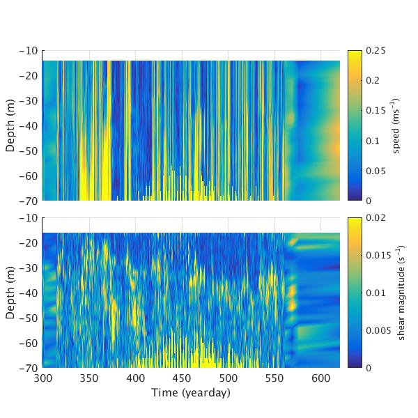 Time-series plots for AOFB 51 ADCP: speed relative to moving ice (top panel) and magnitude of vector shear (bottom panel)