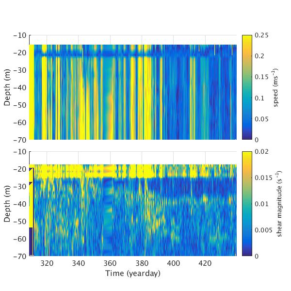 Time-series plots for AOFB 54 ADCP: speed relative to moving ice (top panel) and magnitude of vector shear (bottom panel)