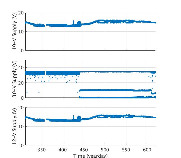 Engineering data plots for AOFB 54: 10-V Supply (top panel), 12-V wind generator battery voltage (second panel) and 40-V Voltage supply (bottom panel)