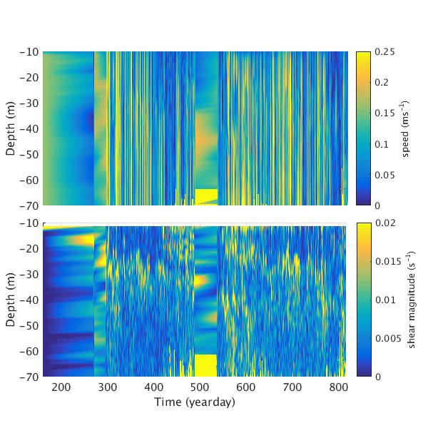 Time-series plots for AOFB 55 ADCP: speed relative to moving ice (top panel) and magnitude of vector shear (bottom panel)