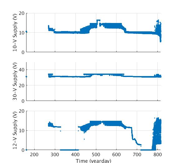 Engineering data plots for AOFB 55: 10-V Supply (top panel), 12-V wind generator battery voltage (second panel) and 40-V Voltage supply (bottom panel)
