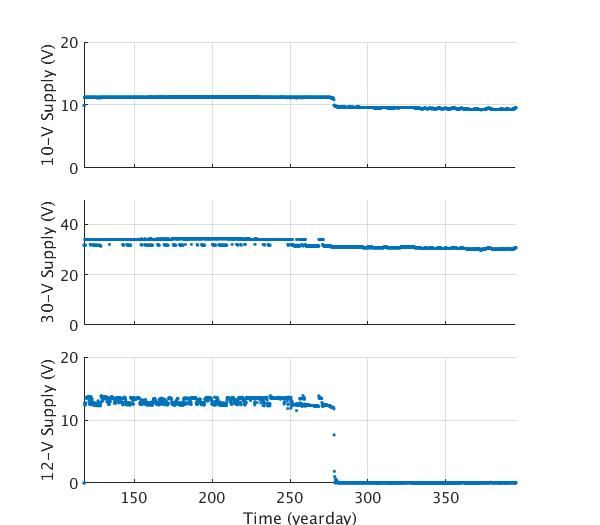 Engineering data plots for AOFB 5: 10-V Supply (top panel), 12-V wind generator battery voltage (second panel) and 40-V Voltage supply (bottom panel)