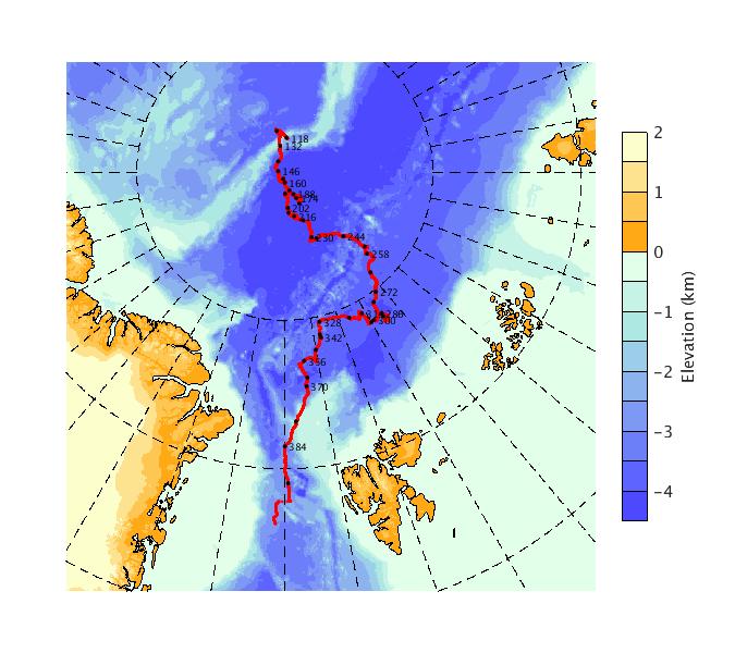 Map of AOFB 5 drift trajectory. Black dots on the map indicate biweekly positions labeled with corresponding yearday values.
